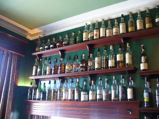 | マッカランのビンテ−ジなどよだれもののウイスキ−が並ぶバ−のボトル棚 |